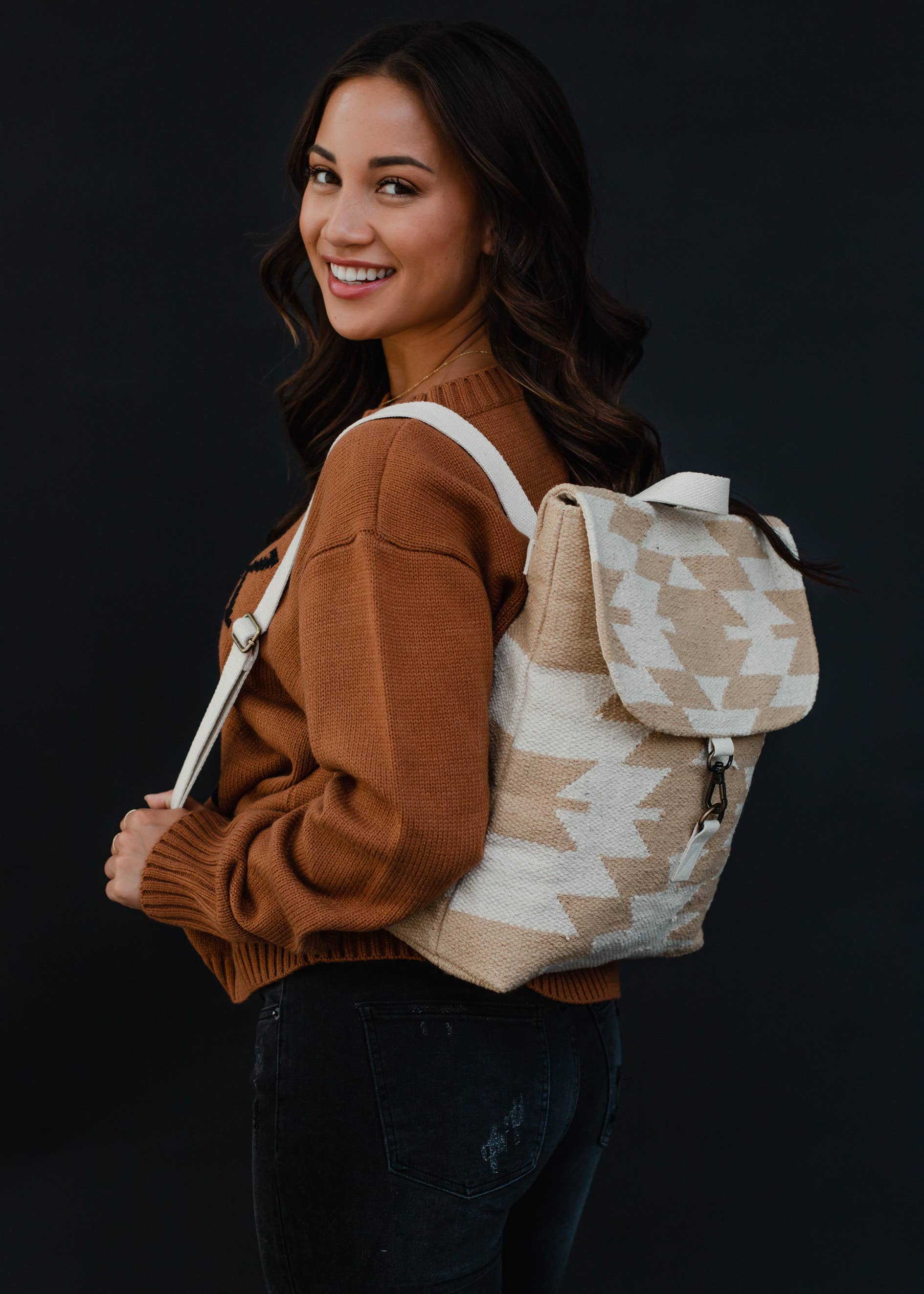 Tan & cream Aztec backpack that's equal parts practical and pretty—because your daily essentials deserve to travel in style. Featuring a secure clasp closure that actually stays closed (revolutionary, we know), adjustable straps and a sturdy handle that won't judge you for overpacking. Measuring 14" x 11.5" x 4.5", it's the Goldilocks of backpacks: roomy enough for your laptop, snacks, and that book you swear you'll read, but not so massive you look like you're moving across the country. Crafted from 100% cotton with a timeless geometric pattern that works whether you're heading to the office, campus, or your favorite coffee shop.