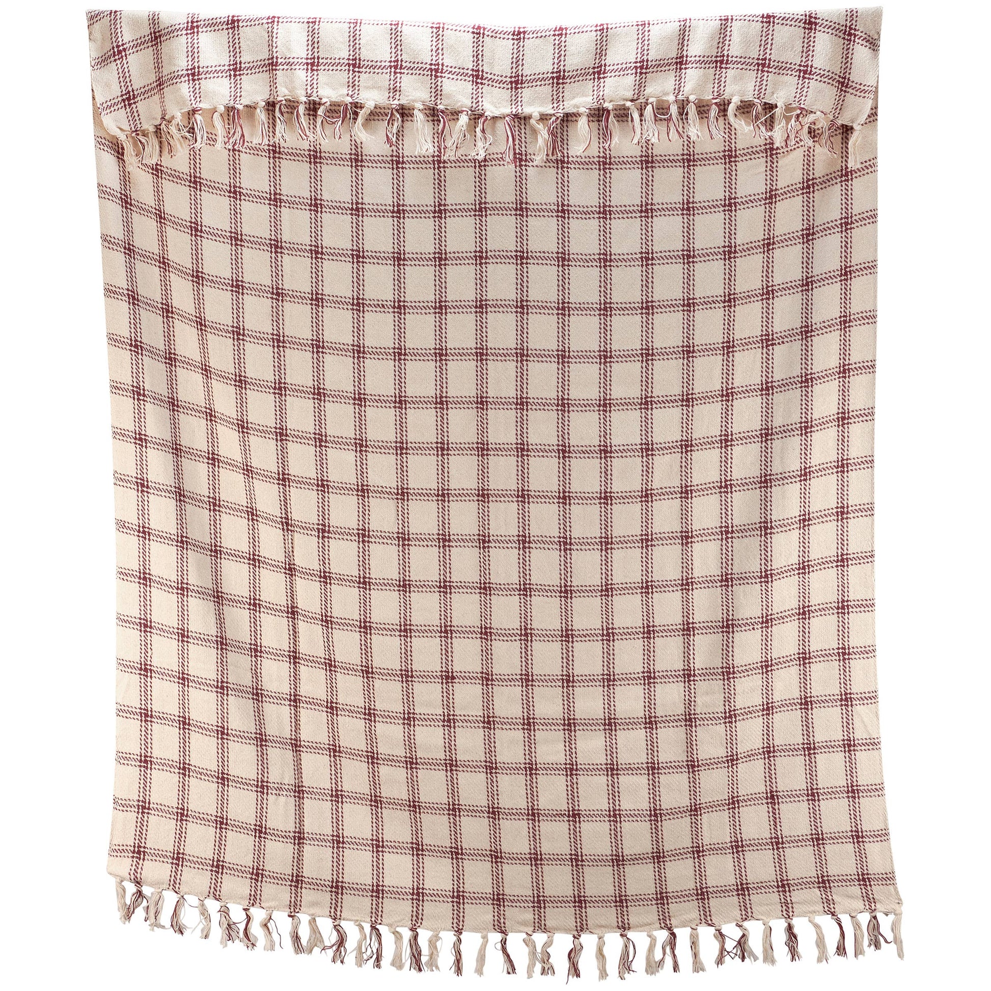 A cotton throw blanket from our Fall & Harvest Collection displaying a plaid pattern in a blush inspired fall color palette woven throughout with tassels on top and bottom edge. Seasonal throw blanket measures 50 x 60 inches giving plenty of coverage to accent furniture or to cozy up under the blanket. Our Burgundy Plaid throw blanket is conveniently machine-washable for easy cleaning. A blush inspired fall home accent perfect for seasonal use.
