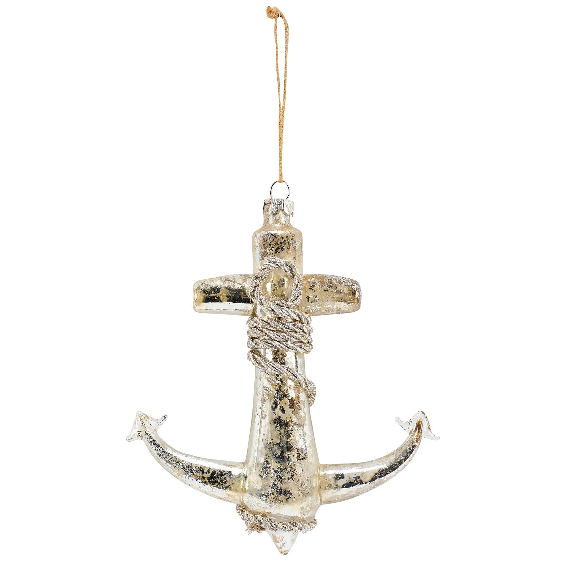 A glass ornament from our Beach Collection displaying a nautical inspired anchor design with distressed details and rope accent. Our glass Anchor ornament is ready to hang for display via the included top loop. A vintage style gift perfect for adding personality to a Christmas tree or for everyday beach-themed displays.