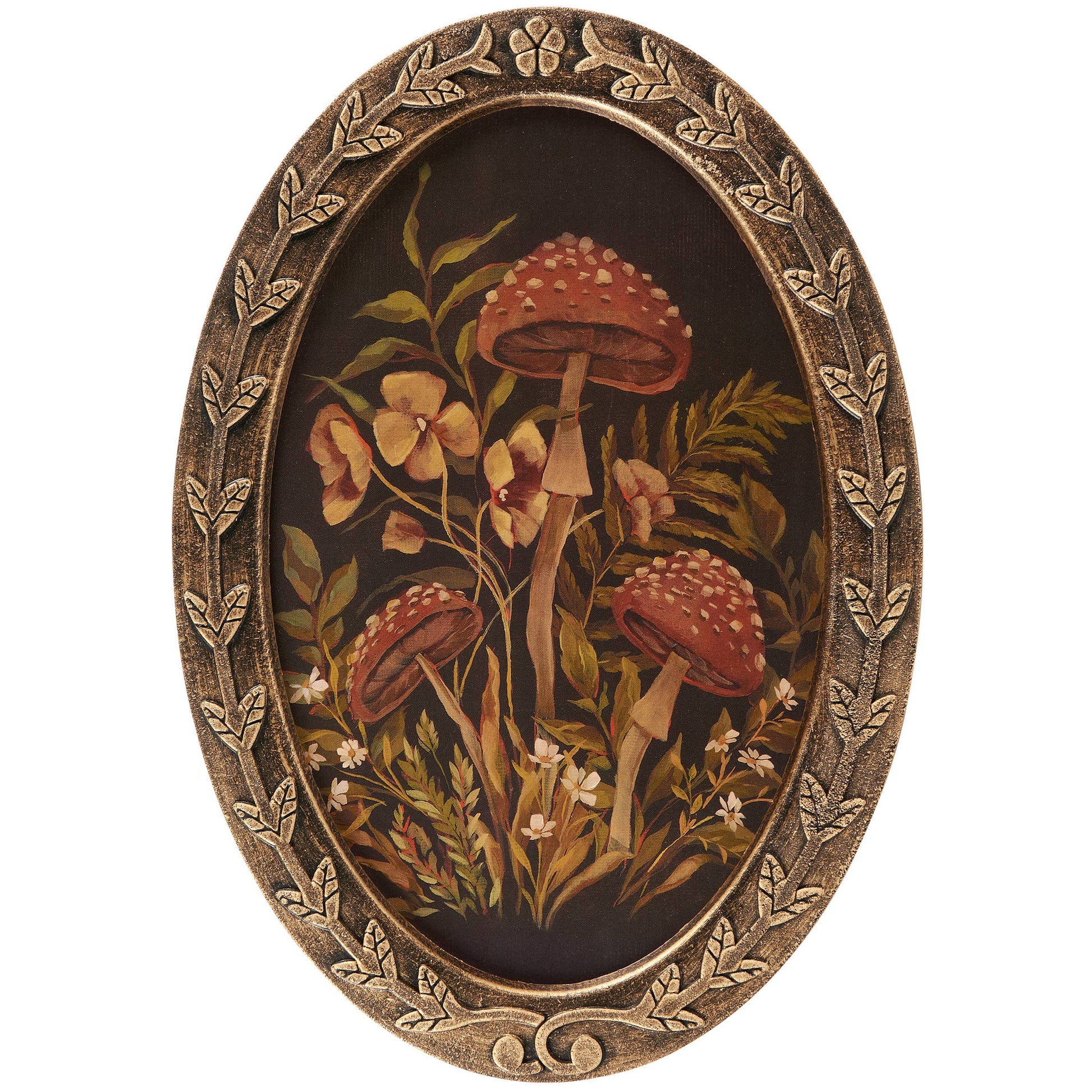 A framed art piece from our Moody Collection displaying hand painted mushrooms and wildflowers in a deep color palette. Garden design is replicated from original artwork hand painted in a unique watercolor style. Frame features molded ornate design with metallic antique wash for a vintage style. Our Hidden Garden framed wall art is easy to hang for display via attached sawtooth hanger on the back. A moody home accent perfect for everyday display.