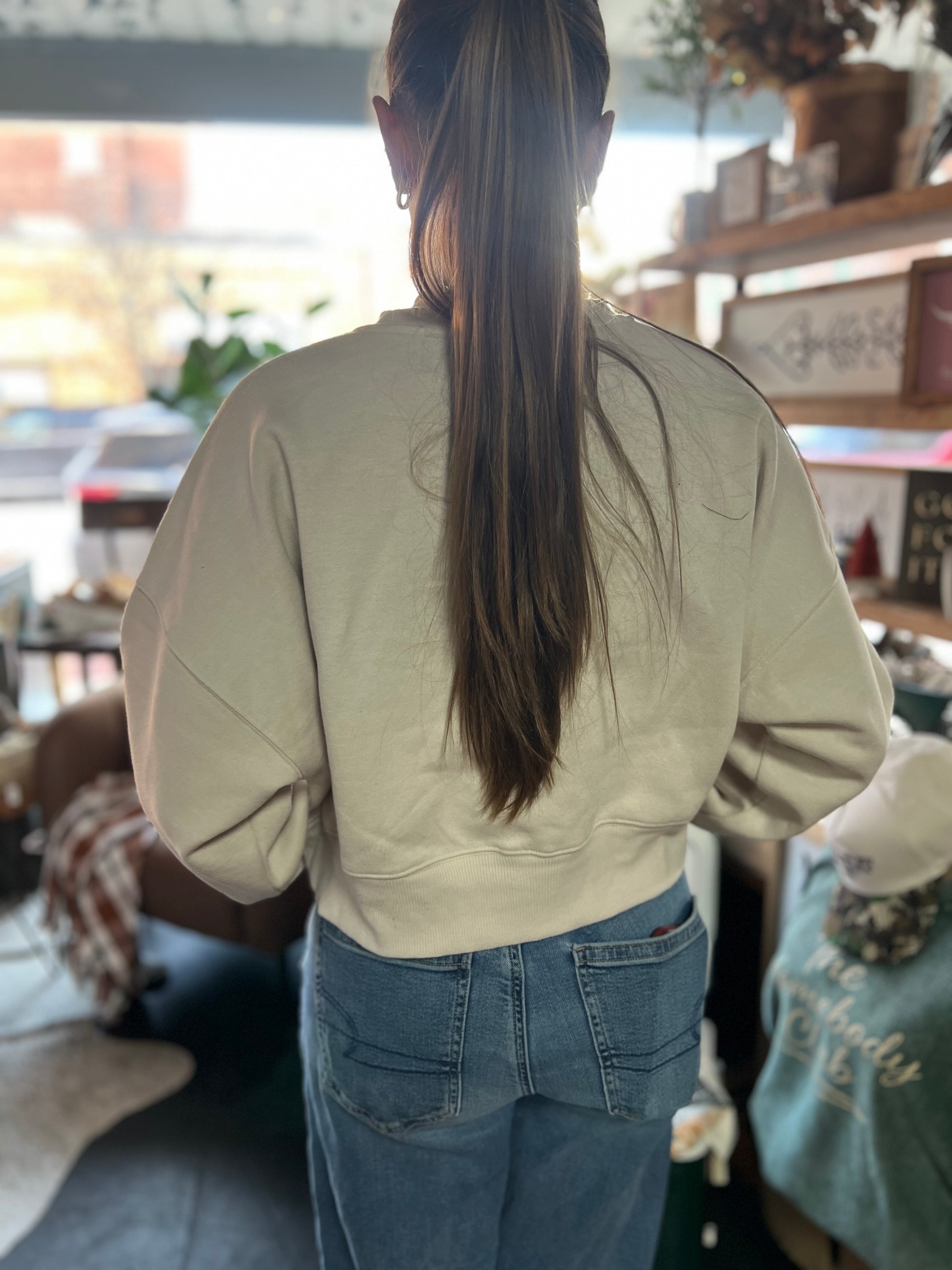 This crew is a ladies fit. It’s a boxy slightly cropped style. A little more length on the back of the crew than the front. Rib on neck and cuff add to the classic look that everybody loves.